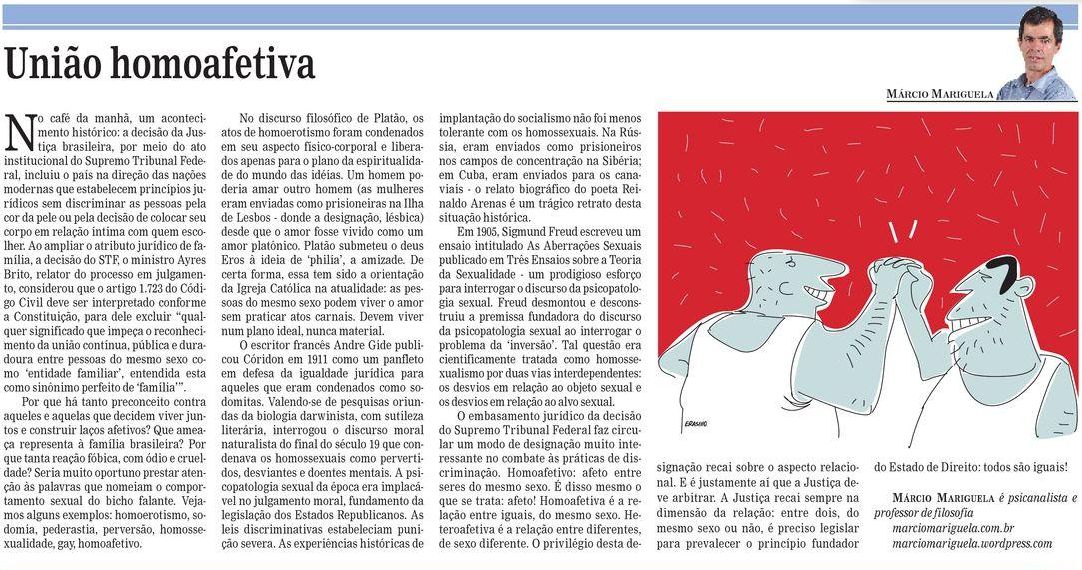 Artigos, Jornais União homoafetiva 12/05/2011 Márcio Mariguela Artigo publicado em 12 de Maio de 2011 no Jornal de Piracicaba: